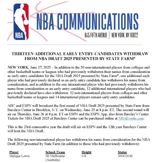 NBA官宣最终提前选秀名单剩46人:杨瀚森在列 林葳到年龄自动参选
